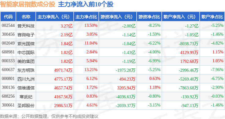 资金流向方面,智能家居(399996)指数成份股当日主力资金净流出合计70.28亿元,游资资金净流入合计18.83亿元,散户资金净流入合计51.45亿元。成份股资金流向详情见下表: