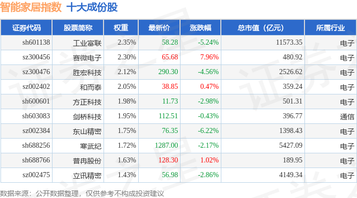 智能家居(399996)指数十大成份股详情如下: