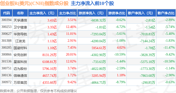 资金流向方面,创业板R(美元)(CNH)(470007)指数成份股当日主力资金净流出合计77.35亿元,游资资金净流入合计26.61亿元,散户资金净流入合计50.75亿元。成份股资金流向详情见下表: