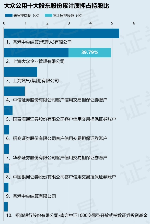 截止本公告日,股东上海大众企业管理有限公司已累计质押股份1.97亿股,占其持股总数的39.79%。本次质押后大众公用十大股东的累计质押股份占持股比例(占持股比例的计算以公司最新一期财务报表公布的十大股东的持股总数为基准)见下图: