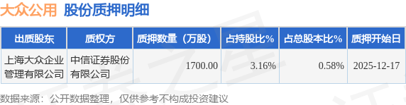 证券之星消息,大众公用(600635)12月18日公开信息显示,股东上海大众企业管理有限公司向中信证券股份有限公司合计质押1700.0万股,占总股本0.58%。质押详情见下表: