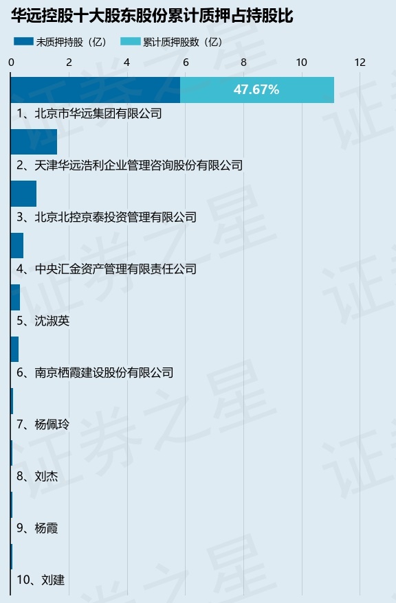 截止本公告日,股东北京市华远集团有限公司已累计质押股份5.3亿股,占其持股总数的47.67%。本次质押后华远控股十大股东的累计质押股份占持股比例(占持股比例的计算以公司最新一期财务报表公布的十大股东的持股总数为基准)见下图: