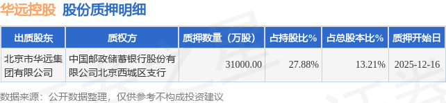 证券之星消息,华远控股(600743)12月18日公开信息显示,股东北京市华远集团有限公司向中国邮政储蓄银行股份有限公司北京西城区支行合计质押3.1亿股,占总股本13.21%。质押详情见下表: