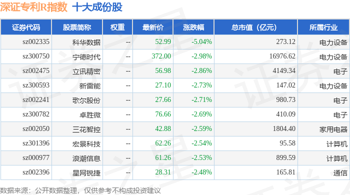 深证专利R(470067)指数十大成份股详情如下:
