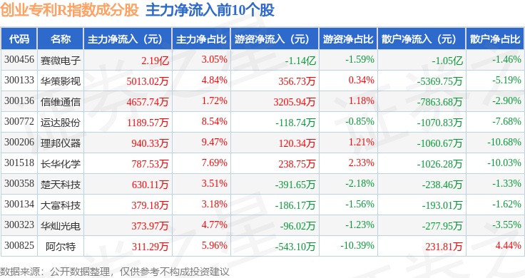 资金流向方面,创业专利R(470068)指数成份股当日主力资金净流出合计34.8亿元,游资资金净流入合计8.1亿元,散户资金净流入合计26.71亿元。成份股资金流向详情见下表: