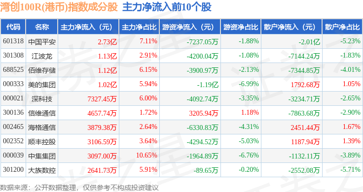 资金流向方面,湾创100R(港币)(480002)指数成份股当日主力资金净流出合计69.82亿元,游资资金净流入合计22.2亿元,散户资金净流入合计47.62亿元。成份股资金流向详情见下表: