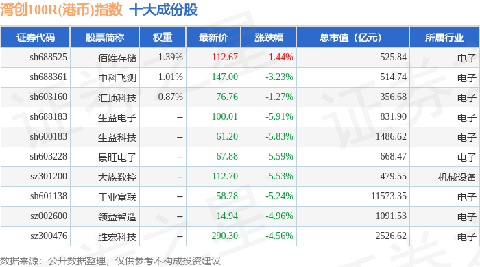 湾创100R(港币)(480002)指数十大成份股详情如下: