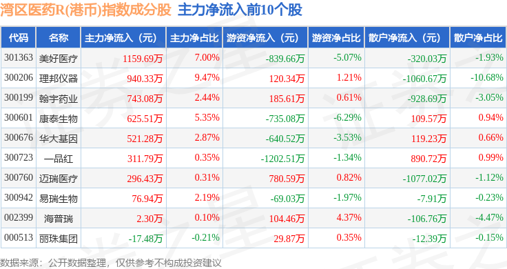 资金流向方面,湾区医药R(港币)(480014)指数成份股当日主力资金净流出合计2.36亿元,游资资金净流出合计5017.27万元,散户资金净流入合计2.87亿元。成份股资金流向详情见下表: