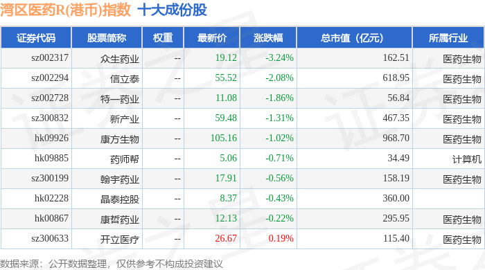 湾区医药R(港币)(480014)指数十大成份股详情如下: