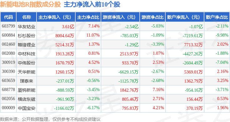 资金流向方面,新能电池R(480032)指数成份股当日主力资金净流出合计36.69亿元,游资资金净流入合计4.17亿元,散户资金净流入合计32.08亿元。成份股资金流向详情见下表: