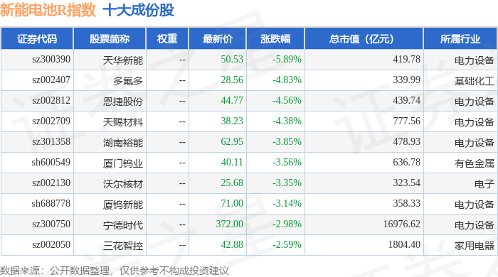 新能电池R(480032)指数十大成份股详情如下: