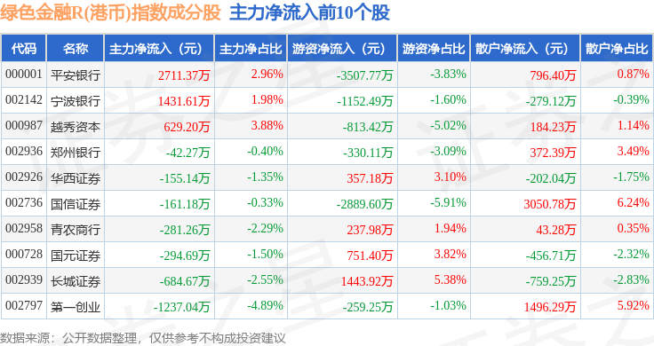 资金流向方面,绿色金融R(港币)(480053)指数成份股当日主力资金净流出合计6.11亿元,游资资金净流入合计1.62亿元,散户资金净流入合计4.49亿元。成份股资金流向详情见下表: