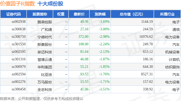 证券之星消息,12月18日,价值因子R(480056)指数报收于3186.6点,跌0.51%,成交329.86亿元,换手率0.58%。当日该指数成份股中,上涨的有13家,华测导航以2.96%的涨幅领涨,下跌的有35家,鹏鼎控股以3.69%的跌幅领跌。