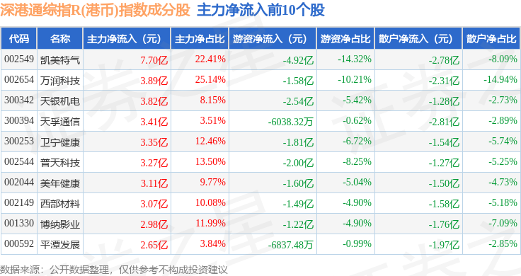 资金流向方面,深港通综指R(港币)(483006)指数成份股当日主力资金净流出合计213.91亿元,游资资金净流入合计8.57亿元,散户资金净流入合计205.34亿元。成份股资金流向详情见下表: