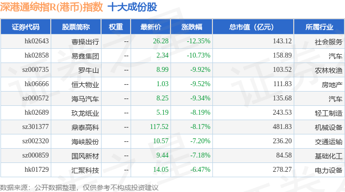 深港通综指R(港币)(483006)指数十大成份股详情如下:
