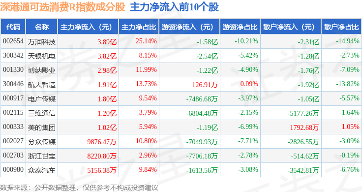 资金流向方面,深港通可选消费R(483019)指数成份股当日主力资金净流出合计5.92亿元,游资资金净流出合计7.74亿元,散户资金净流入合计13.67亿元。成份股资金流向详情见下表: