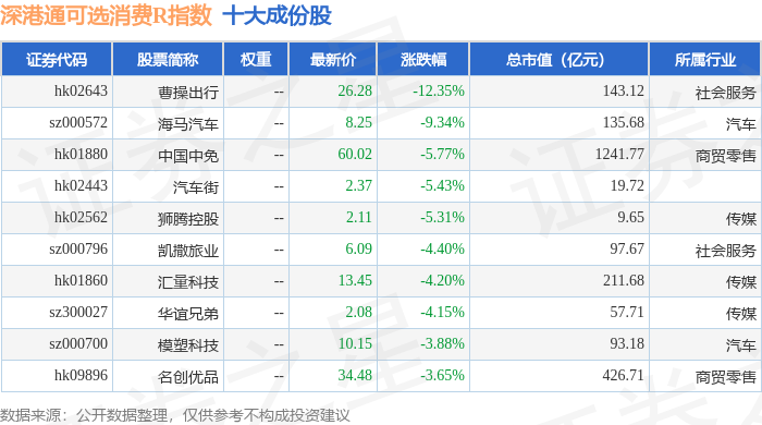 深港通可选消费R(483019)指数十大成份股详情如下: