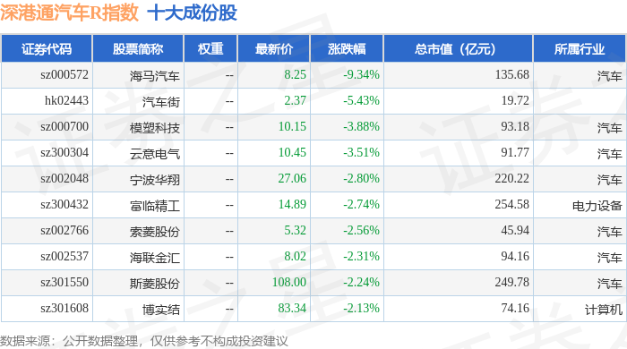 深港通汽车R(483039)指数十大成份股详情如下: