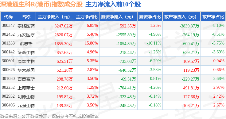 资金流向方面,深港通生科R(港币)(483060)指数成份股当日主力资金净流出合计5779.31万元,游资资金净流出合计8390.15万元,散户资金净流入合计1.42亿元。成份股资金流向详情见下表:
