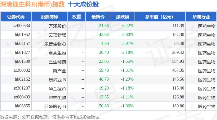 深港通生科R(港币)(483060)指数十大成份股详情如下: