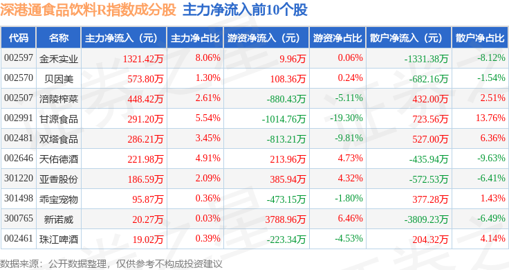 资金流向方面,深港通食品饮料R(483065)指数成份股当日主力资金净流出合计5.93亿元,游资资金净流出合计2622.8万元,散户资金净流入合计6.19亿元。成份股资金流向详情见下表: