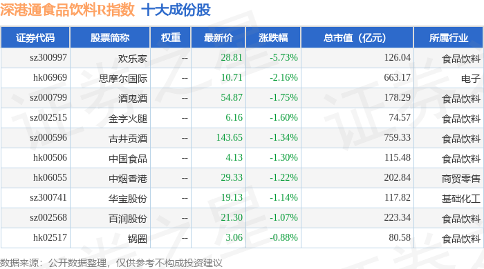 深港通食品饮料R(483065)指数十大成份股详情如下: