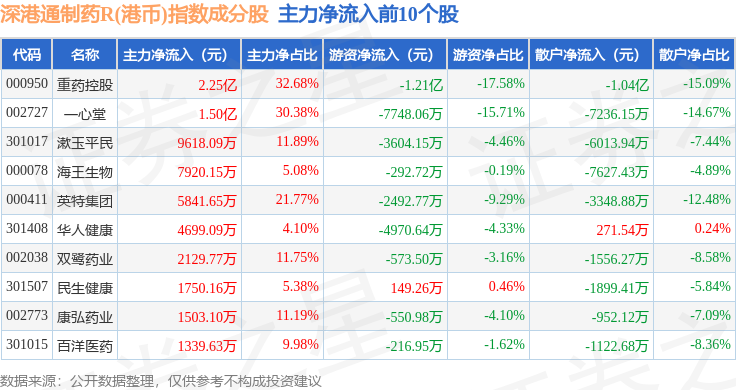 资金流向方面,深港通制药R(港币)(483080)指数成份股当日主力资金净流入合计2.07亿元,游资资金净流出合计3.29亿元,散户资金净流入合计1.22亿元。成份股资金流向详情见下表: