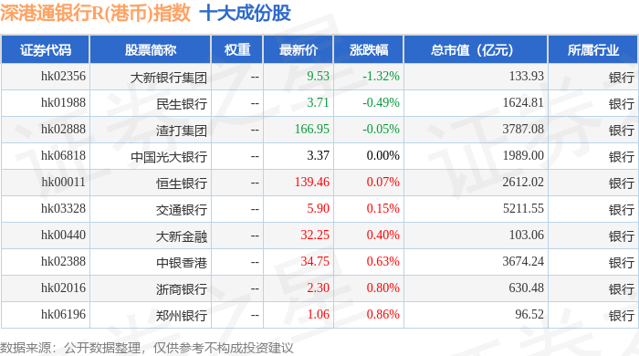 深港通银行R(港币)(483082)指数十大成份股详情如下: