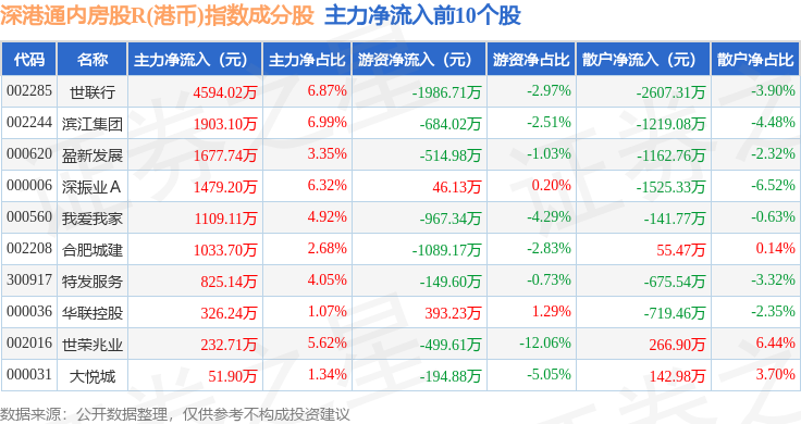 资金流向方面,深港通内房股R(港币)(483084)指数成份股当日主力资金净流出合计9079.25万元,游资资金净流入合计3753.04万元,散户资金净流入合计5326.21万元。成份股资金流向详情见下表: