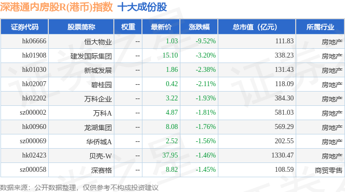 深港通内房股R(港币)(483084)指数十大成份股详情如下: