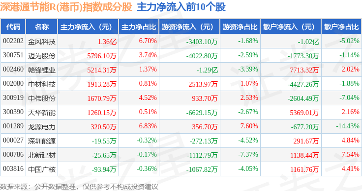 资金流向方面,深港通节能R(港币)(483086)指数成份股当日主力资金净流出合计39.77亿元,游资资金净流入合计7.57亿元,散户资金净流入合计32.2亿元。成份股资金流向详情见下表: