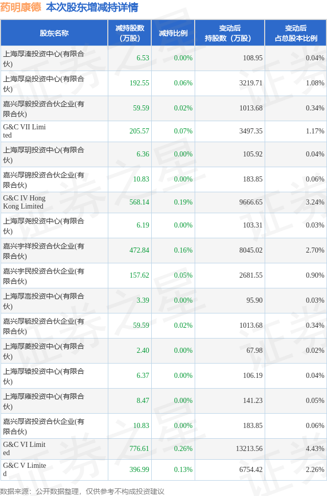 证券之星消息,12月18日药明康德发布公告《药明康德:关于股东权益变动触及1%刻度的提示性公告》,其股东上海厚溱投资中心(有限合伙)、上海厚燊投资中心(有限合伙)、G&C VI Limited、嘉兴厚咨投资合伙企业(有限合伙)、上海厚雍投资中心(有限合伙)、上海厚辕投资中心(有限合伙)、上海厚菱投资中心(有限合伙)、嘉兴厚毓投资合伙企业(有限合伙)、上海厚嵩投资中心(有限合伙)、嘉兴宇民投资合伙企业(有限合伙)、嘉兴宇祥投资合伙企业(有限合伙)、上海厚尧投资中心(有限合伙)、G&C IV Hong Kong Limited、嘉兴厚锦投资合伙企业(有限合伙)、上海厚玥投资中心(有限合伙)、G&C VII Limited、嘉兴厚毅投资合伙企业(有限合伙)、G&C V Limited于2025年11月26日至2025年12月17日间合计减持2950.88万股,占公司目前总股本的0.9889%,变动期间该股股价下跌3.94%,截止12月17日收盘报90.59元。