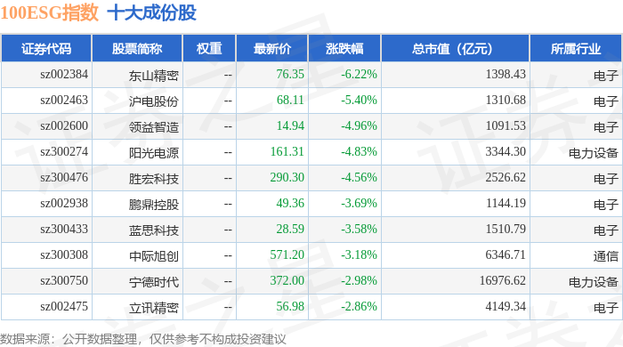 近10日内100ESG(970027)指数成份股做了调整,新纳入了11只股票,剔除了11只股票。