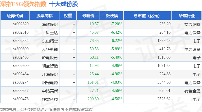 资金流向方面,深指ESG领先(970029)指数成份股当日主力资金净流出合计120.13亿元,游资资金净流入合计29.22亿元,散户资金净流入合计90.91亿元。成份股资金流向详情见下表: