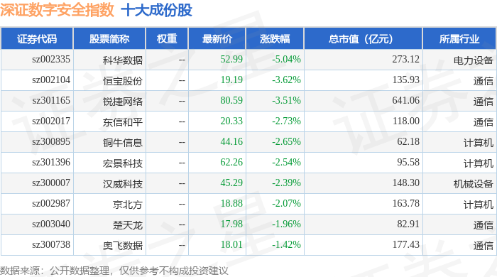 证券之星消息,12月18日,深证数字安全(970052)指数报收于3236.66点,跌0.43%,成交199.35亿元,换手率2.28%。当日该指数成份股中,上涨的有17家,普天科技以6.38%的涨幅领涨,下跌的有32家,科华数据以5.04%的跌幅领跌。