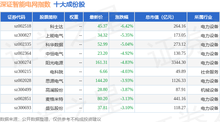 证券之星消息,12月18日,深证智能电网(970054)指数报收于3758.37点,跌2.46%,成交246.08亿元,换手率2.45%。当日该指数成份股中,上涨的有9家,恒华科技以1.77%的涨幅领涨,下跌的有40家,科士达以6.42%的跌幅领跌。