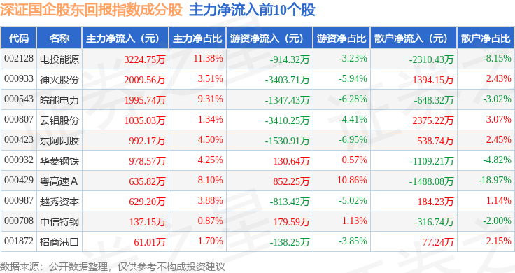 资金流向方面,深证国企股东回报(970064)指数成份股当日主力资金净流出合计13.58亿元,游资资金净流入合计2.51亿元,散户资金净流入合计11.07亿元。成份股资金流向详情见下表: