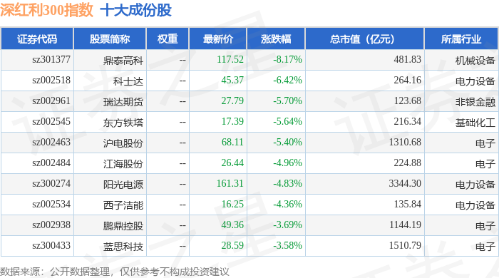 证券之星消息,12月18日,深红利300(970062)指数报收于5497.87点,跌0.04%,成交1518.11亿元,换手率1.27%。当日该指数成份股中,上涨的有125家,重药控股以9.94%的涨幅领涨,下跌的有171家,鼎泰高科以8.17%的跌幅领跌。