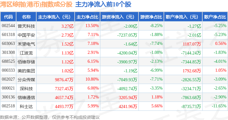 资金流向方面,湾区综指(港币)(980004)指数成份股当日主力资金净流出合计94.3亿元,游资资金净流入合计26.35亿元,散户资金净流入合计67.52亿元。成份股资金流向详情见下表:
