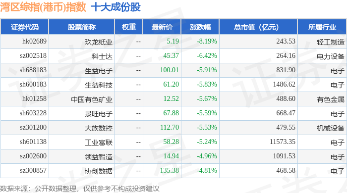 湾区综指(港币)(980004)指数十大成份股详情如下: