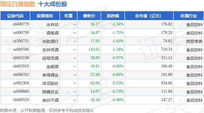 国证白酒(980031)指数十大成份股详情如下: