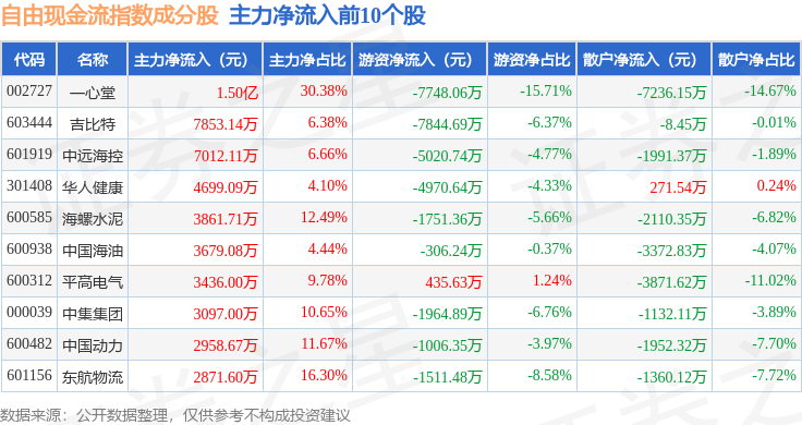资金流向方面,自由现金流(980092)指数成份股当日主力资金净流出合计7.65亿元,游资资金净流出合计1.03亿元,散户资金净流入合计8.68亿元。成份股资金流向详情见下表: