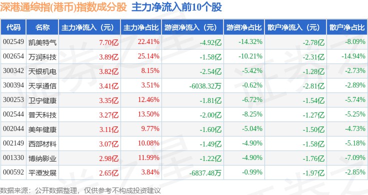 资金流向方面,深港通综指(港币)(983006)指数成份股当日主力资金净流出合计213.91亿元,游资资金净流入合计8.57亿元,散户资金净流入合计205.34亿元。成份股资金流向详情见下表: