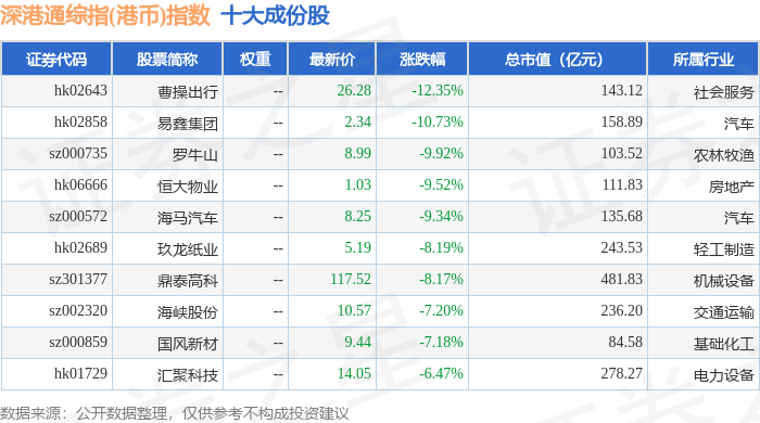 深港通综指(港币)(983006)指数十大成份股详情如下: