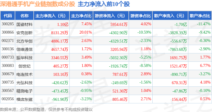 资金流向方面,深港通手机产业链(983009)指数成份股当日主力资金净流出合计50.94亿元,游资资金净流入合计15.42亿元,散户资金净流入合计35.52亿元。成份股资金流向详情见下表: