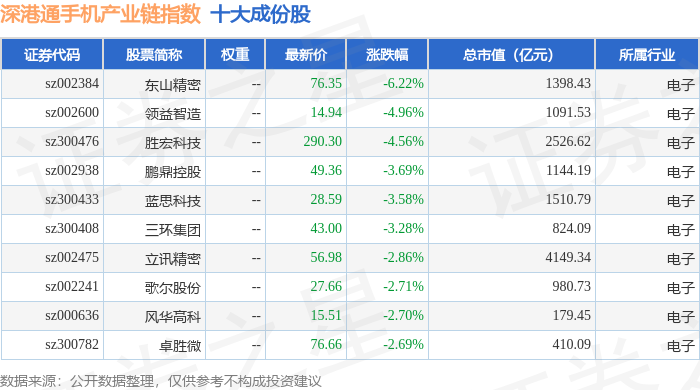 深港通手机产业链(983009)指数十大成份股详情如下: