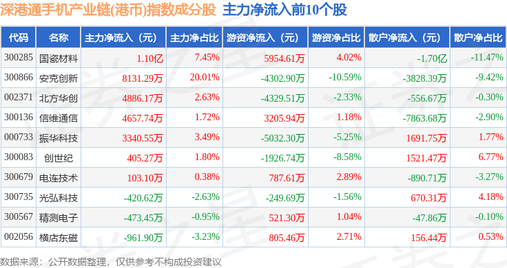 资金流向方面,深港通手机产业链(港币)(983010)指数成份股当日主力资金净流出合计50.94亿元,游资资金净流入合计15.42亿元,散户资金净流入合计35.52亿元。成份股资金流向详情见下表:
