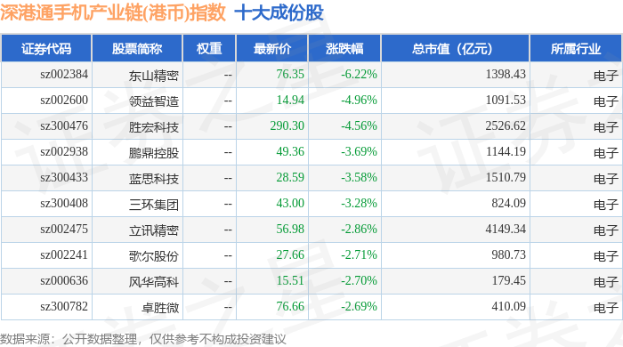 深港通手机产业链(港币)(983010)指数十大成份股详情如下:
