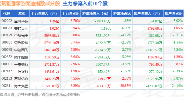 资金流向方面,深港通绿色优选(983011)指数成份股当日主力资金净流出合计24.45亿元,游资资金净流入合计3.19亿元,散户资金净流入合计21.27亿元。成份股资金流向详情见下表: