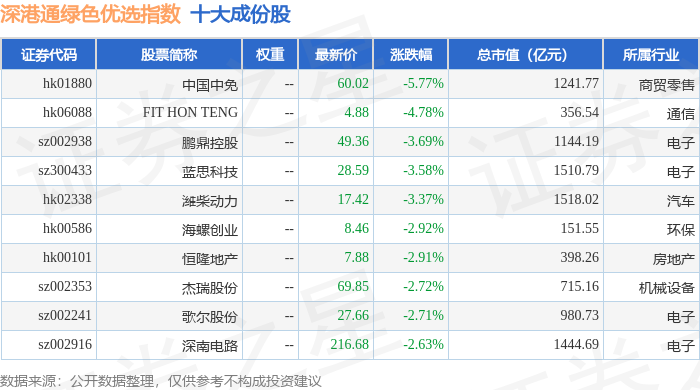深港通绿色优选(983011)指数十大成份股详情如下: